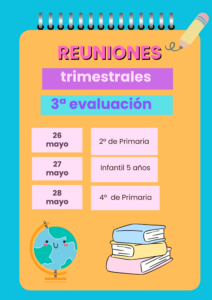 Estas reuniones se llevarán a cabo de manera individualizada en cada aula, con el objetivo de poder tratar aspectos más concretos de cada clase o grupo. En el caso del tercer trimestre, en principio, solo se realizarán las reuniones prescriptivas, es decir, aquellas dirigidas a las familias del alumnado que cambia de ciclo, con el fin de resolver dudas y acompañar la transición a la nueva etapa educativa.