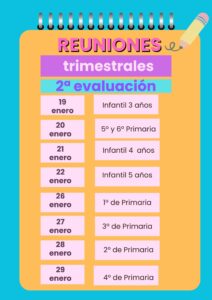 Os adelantamos las fechas de las próximas reuniones con las familias correspondientes al segundo y tercer trimestre. Somos conscientes de la importancia de conocerlas con suficiente antelación para facilitar una mejor organización.